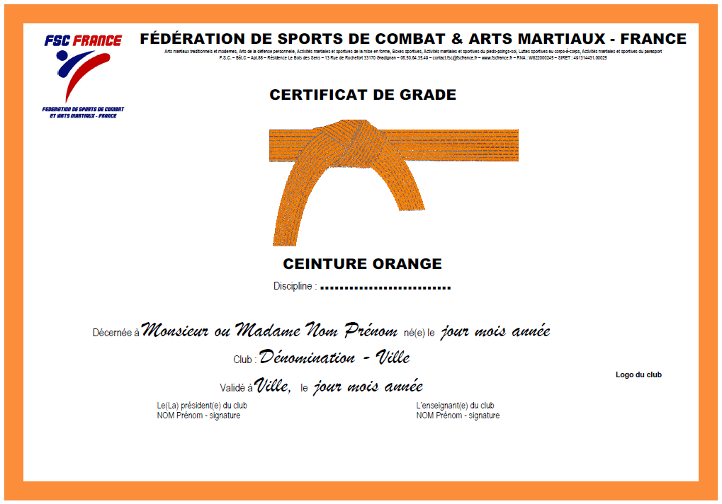 CERTIFICATS POUR LES GRADES DE BASE DÉLIVRÉS EN CLUB PAR LE RESPONSABLE TECHNIQUE